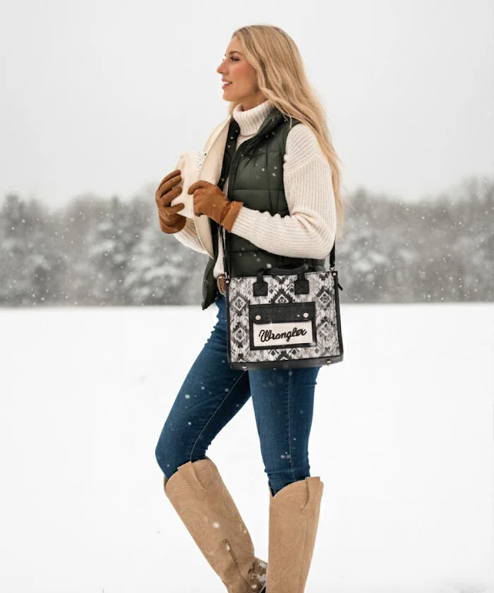 The Wrangler canvas tote bag combines durable construction with boho-chic style, perfect for everyday carry. Featuring a vintage Western geometric pattern and leather-trimmed details, it offers a roomy interior with multiple compartments for organized storage.