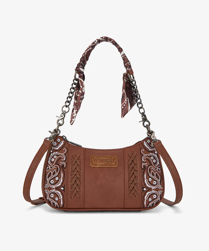 Discover the Wrangler Paisley Chain Shoulder Bag, a boho-western style faux leather bag with a paisley pattern and braided detailing. The standout shoulder strap is wrapped with a patterned scarf detail and finished with chain accents, adding a stylish and versatile touch.