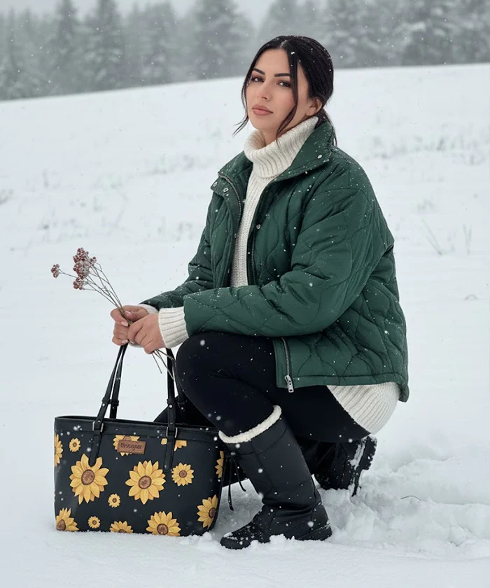 The Wrangler sunflower tote bag is a stylish and functional wide tote bag that combines western charm with everyday practicality, featuring a bold sunflower pattern and branded appliqué. Crafted from durable vegan leather, this Wrangler tote bag features a top zipper closure and ergonomic double handles for a secure, comfortable carry.